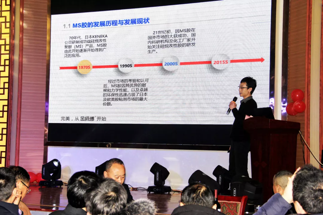 建筑胶粘剂高级工程师王诗文先生详细介绍了玉龙建材2019年明星新品,一上市就火爆日本、欧美的神奇胶黏剂—MS改性硅烷防霉胶,MS改性硅烷防霉胶凭借其更优异的性能,给传统胶黏剂“劳模”---硅酮胶的市场份额带来了前所未有的严峻挑战,此产品的一经发布,也得到了现场朋友们的疯狂打Call。